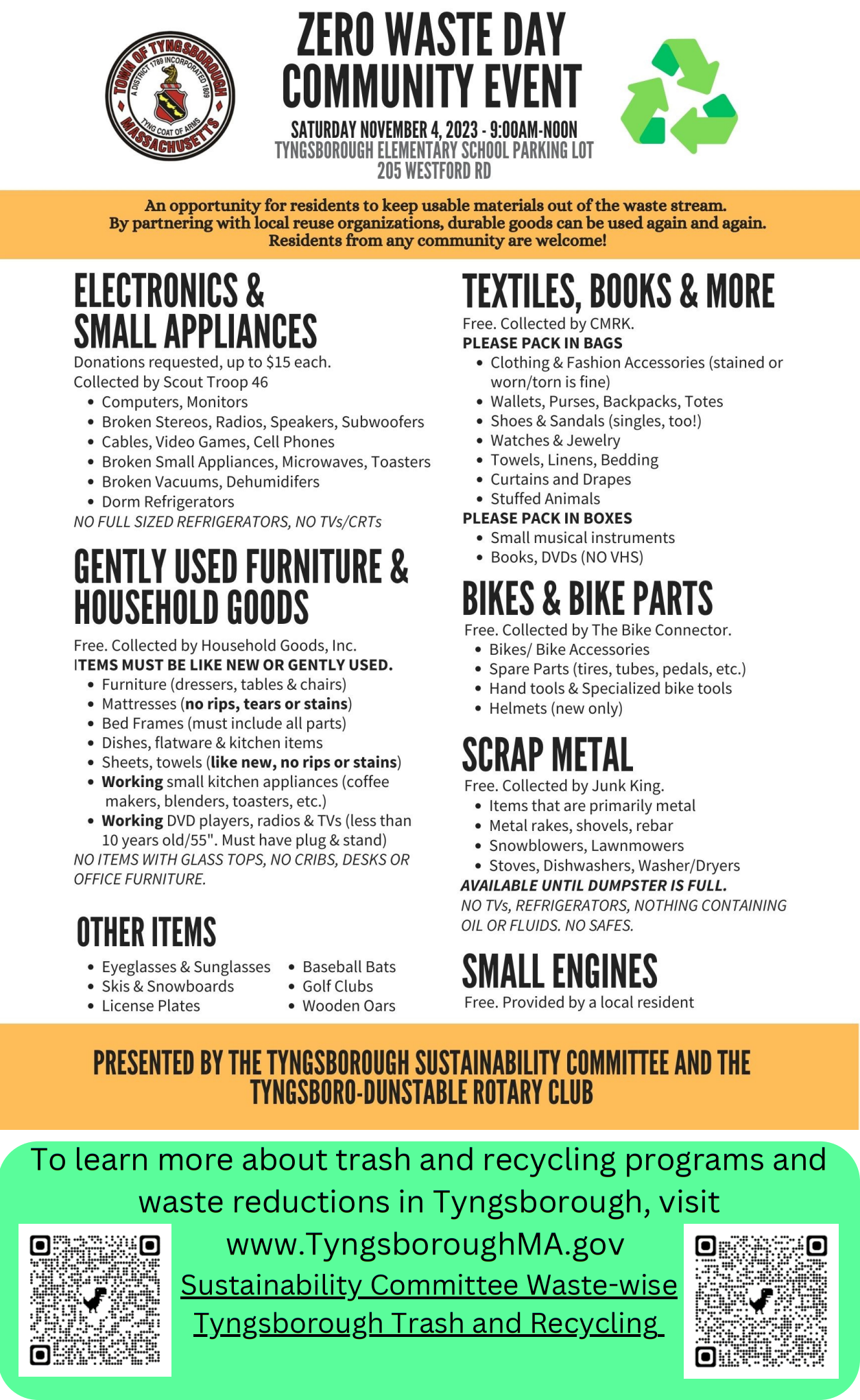 Held the first Saturday of November and of May every year from 9 am to Noon at the Elementary School located at 205 Westford Road. All items collected will be reused or recycled.