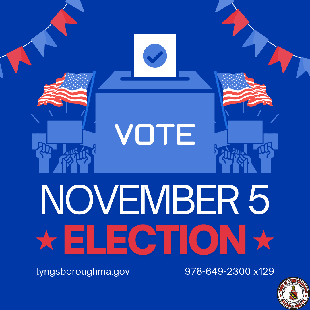 As a reminder, residents who vote in Precinct 1 and Precinct 2 will vote at the Tyngsborough Middle School (50 Norris Road) and residents who vote in Precinct 3 and Precinct 4 vote at Tyngsborough Elementary School (205 Westford Road). You can check your voting location and confirm your voter registration here.