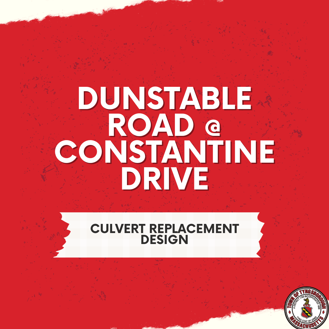 The Town of Tyngsborough was awarded a Municipal Vulnerability Preparedness (MVP) Grant to design the replacement of a failed culvert on Dunstable Road at Constantine Drive. Residents in the area will notice flagging & survey work beginning this week.